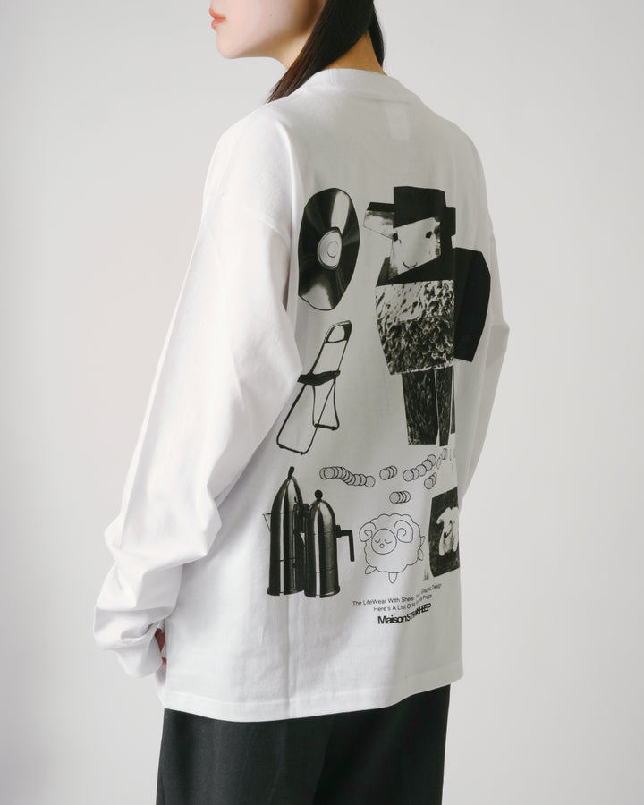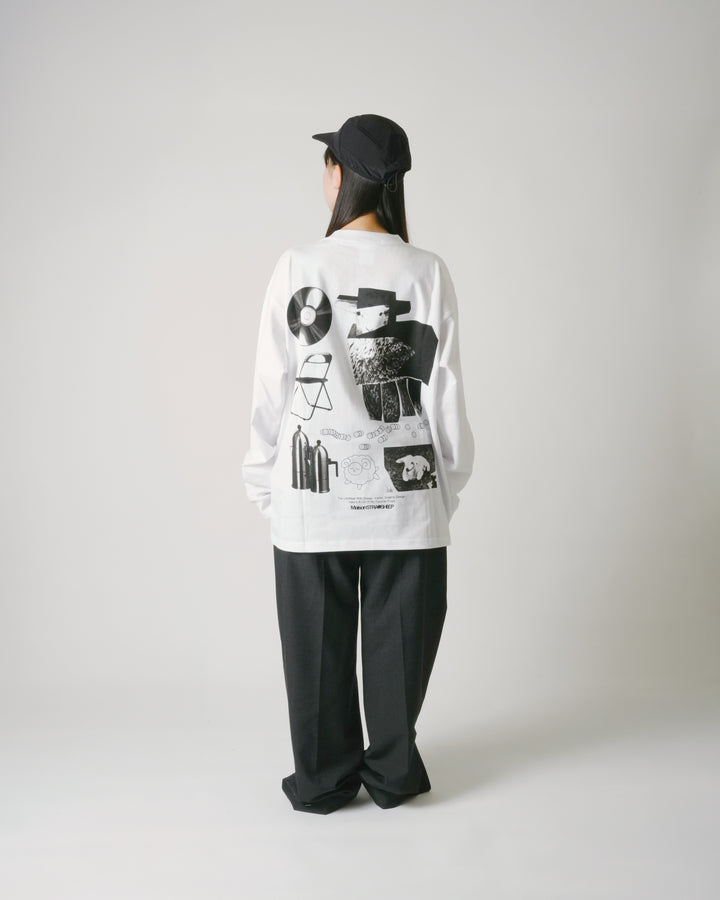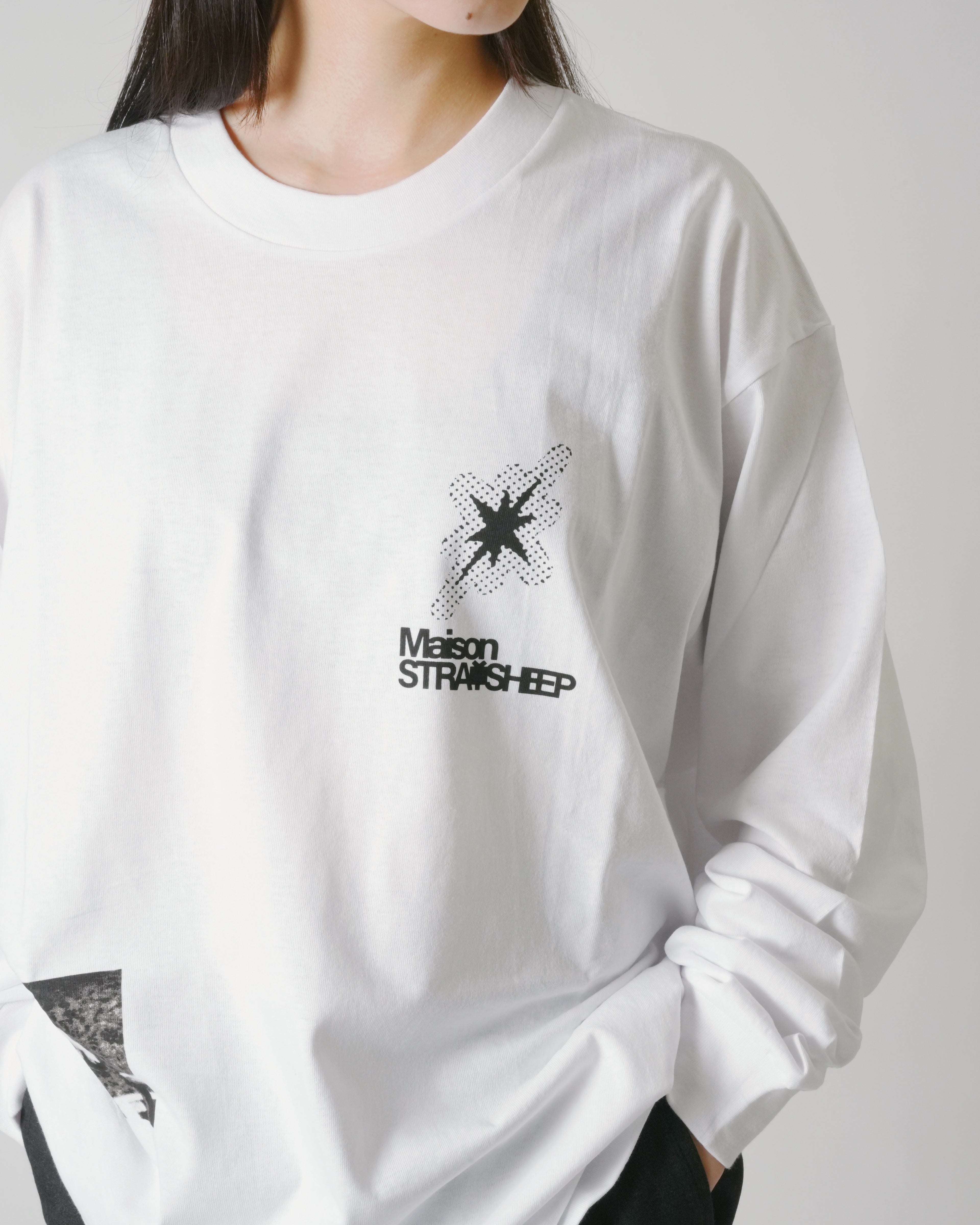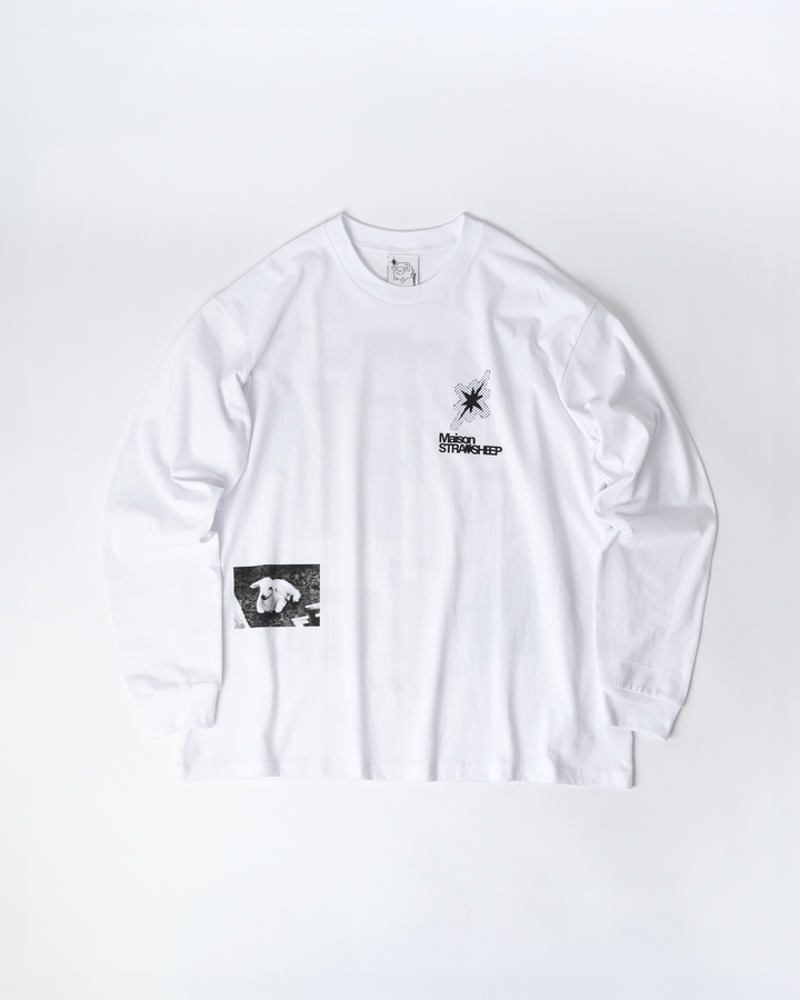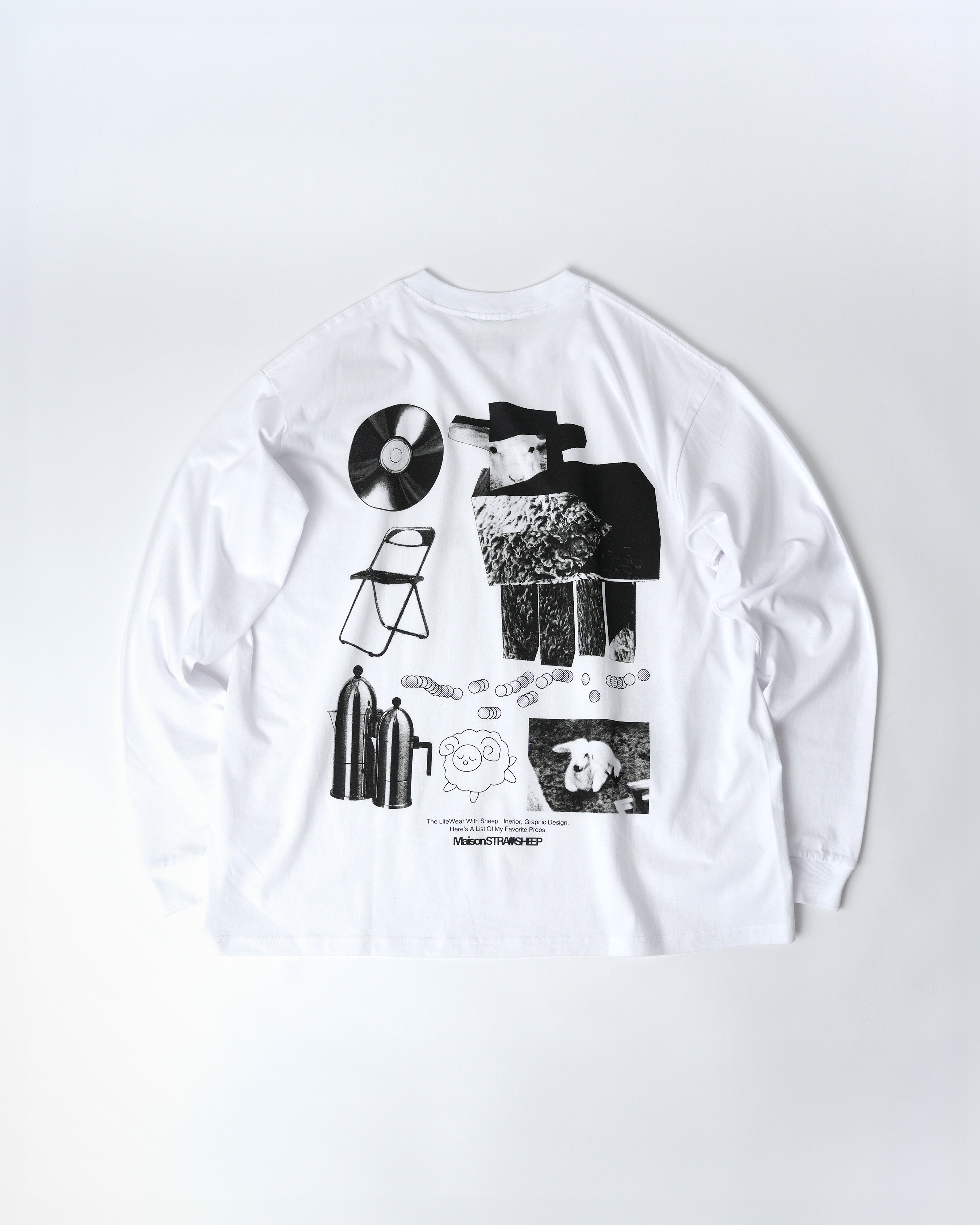 MAISON STRAYSHEEPのお気に入りをあつめた一着。フロント胸部には星のモチーフ、右腹部にはデザイナーが撮影した仔羊のフォトプリント。背面には小道具やブランドに関連するモチーフを散りばめました。