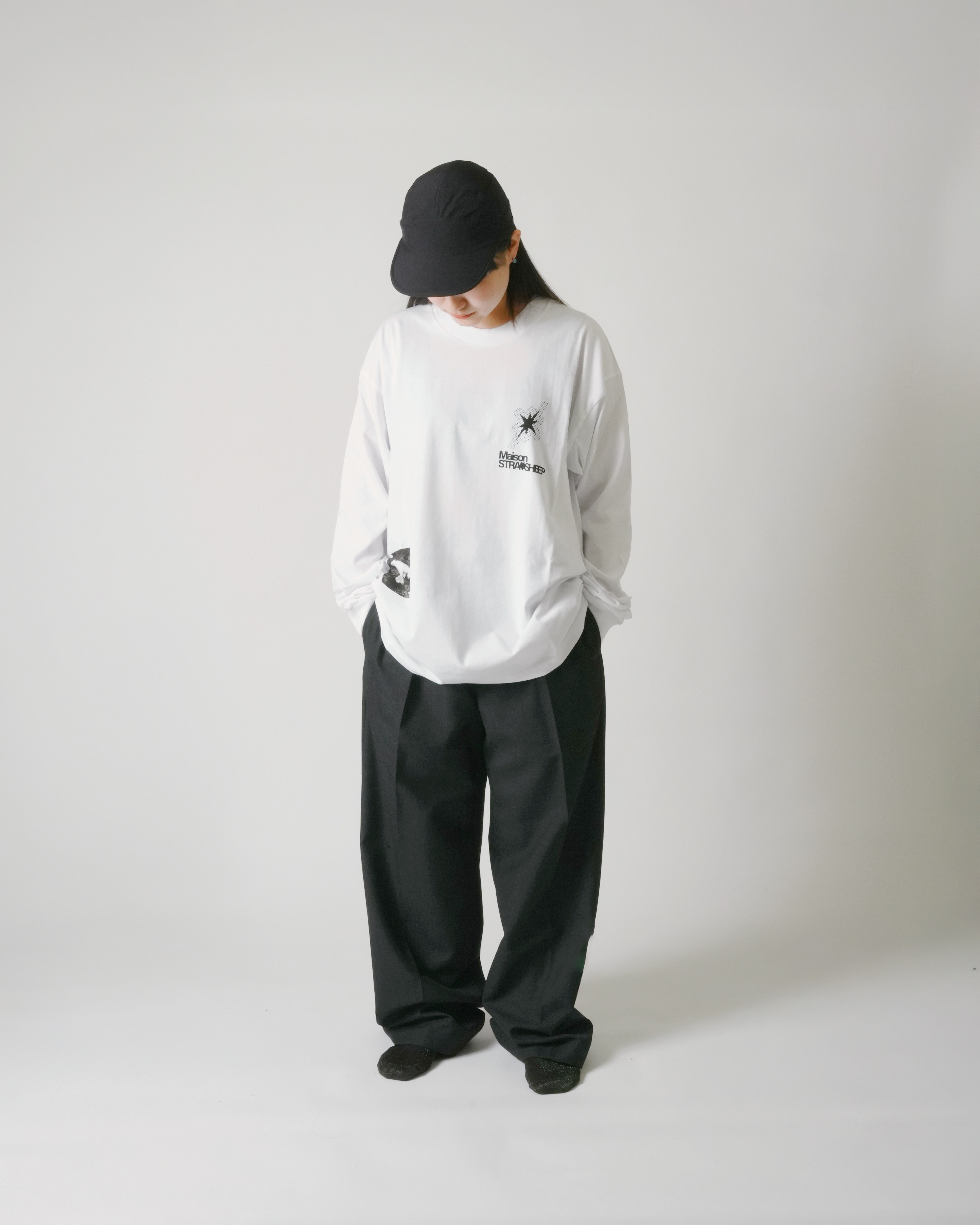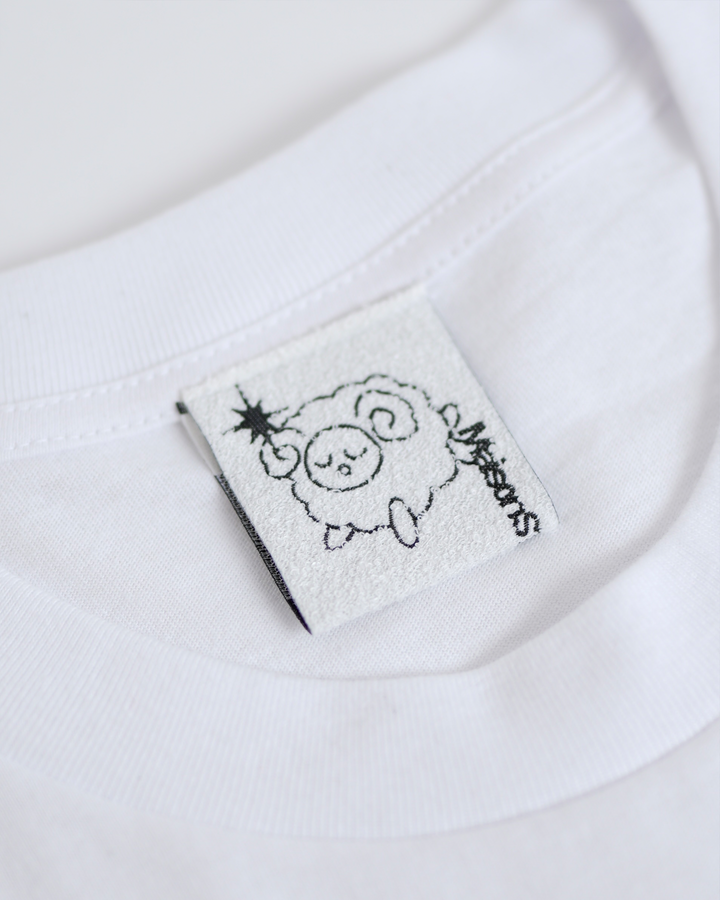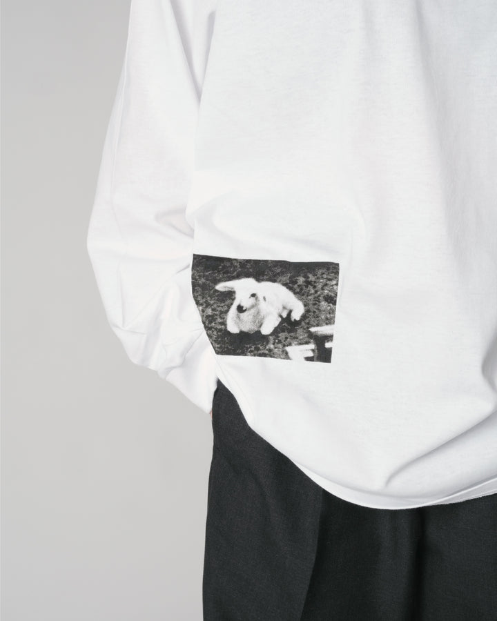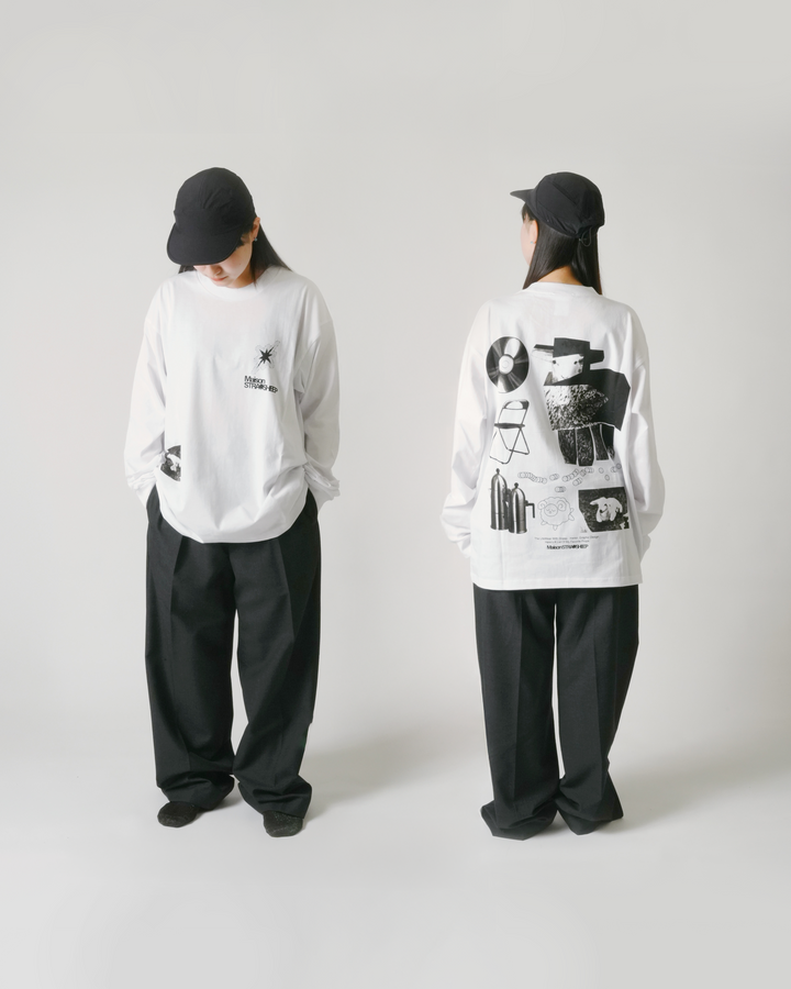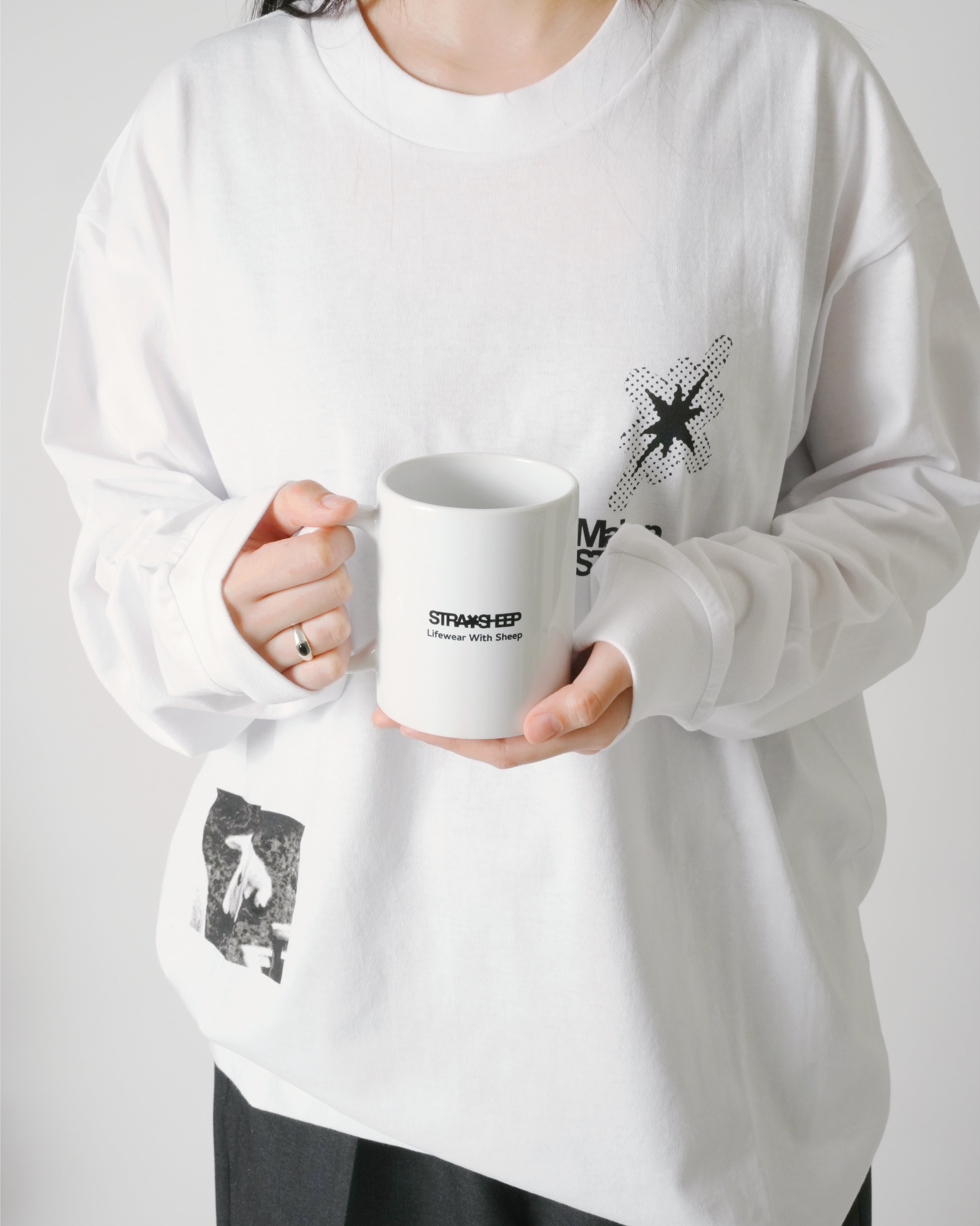 MAISON STRAYSHEEPのお気に入りをあつめた一着。フロント胸部には星のモチーフ、右腹部にはデザイナーが撮影した仔羊のフォトプリント。背面には小道具やブランドに関連するモチーフを散りばめました。