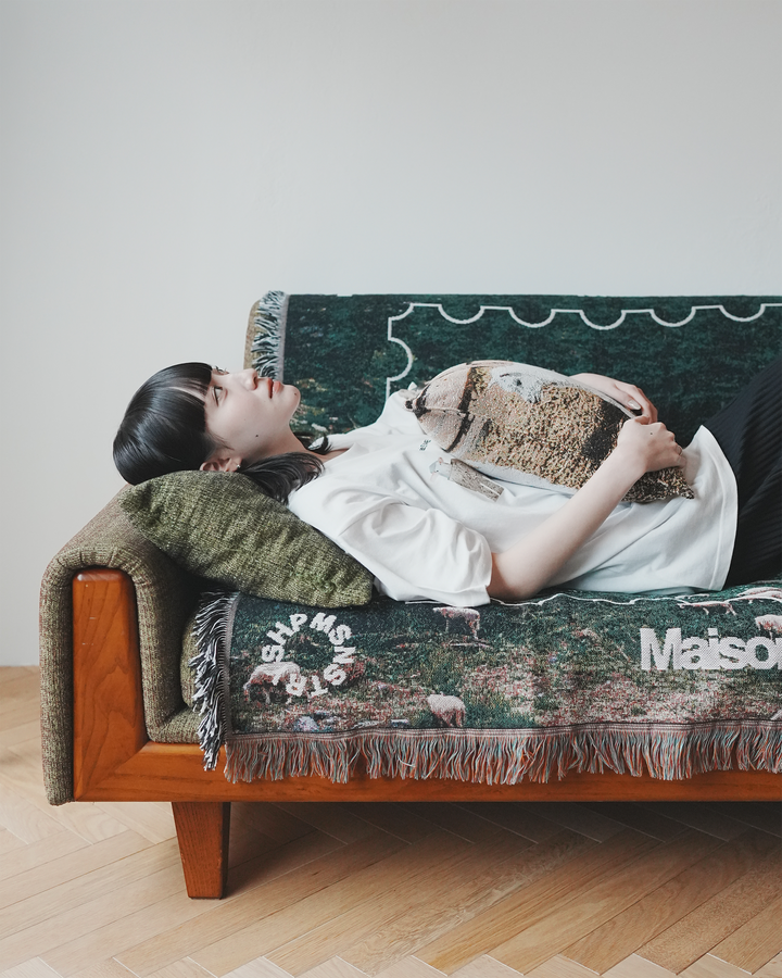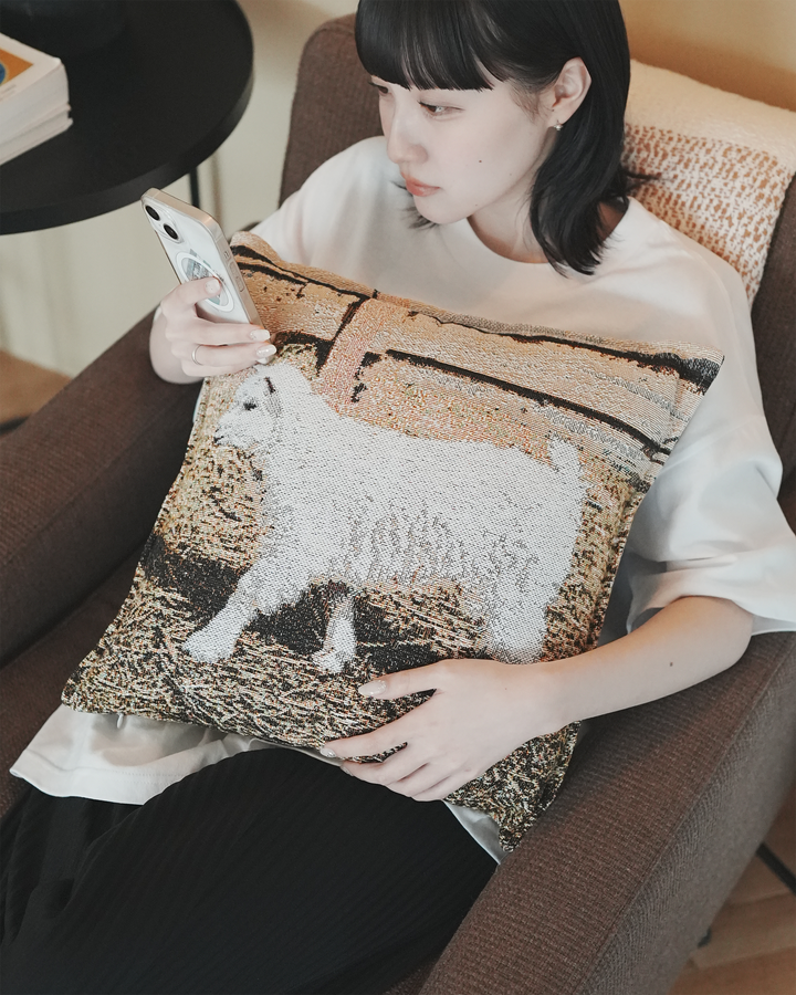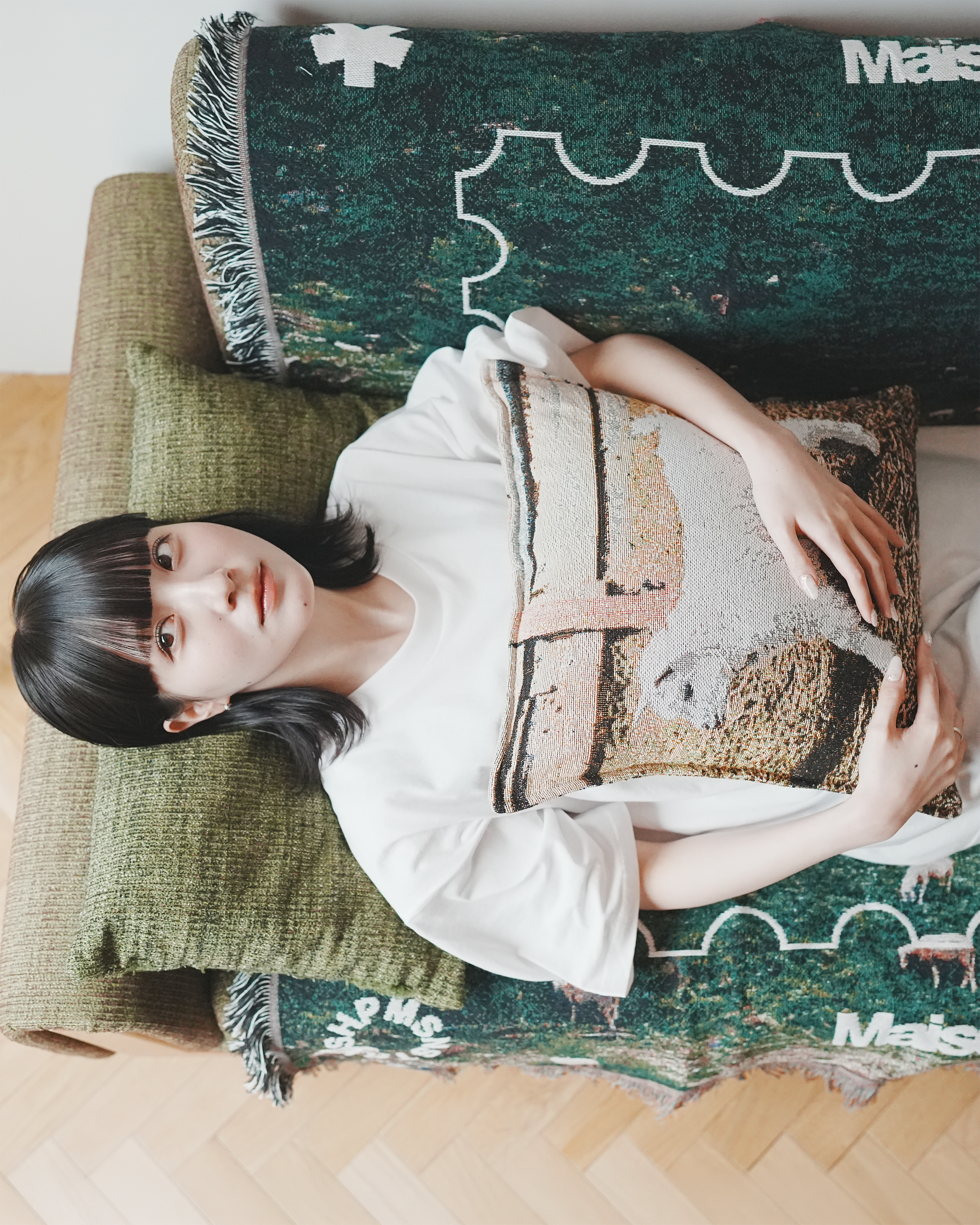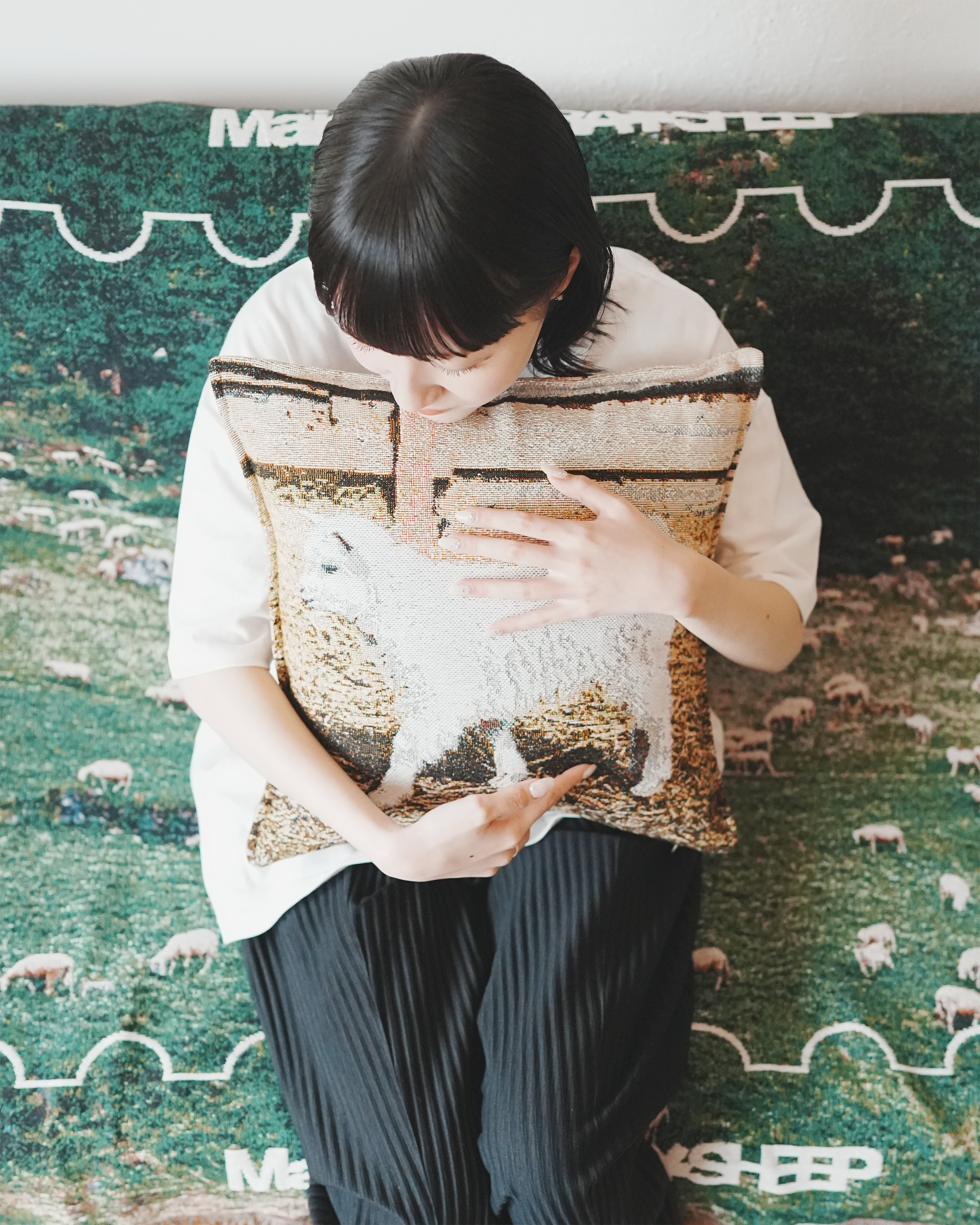 STRAYSHEEP RUGと同じ生地を使用し、MAISON STRAYSHEEPのアイコンである羊のイメージを、ジャカード織で表現しています。