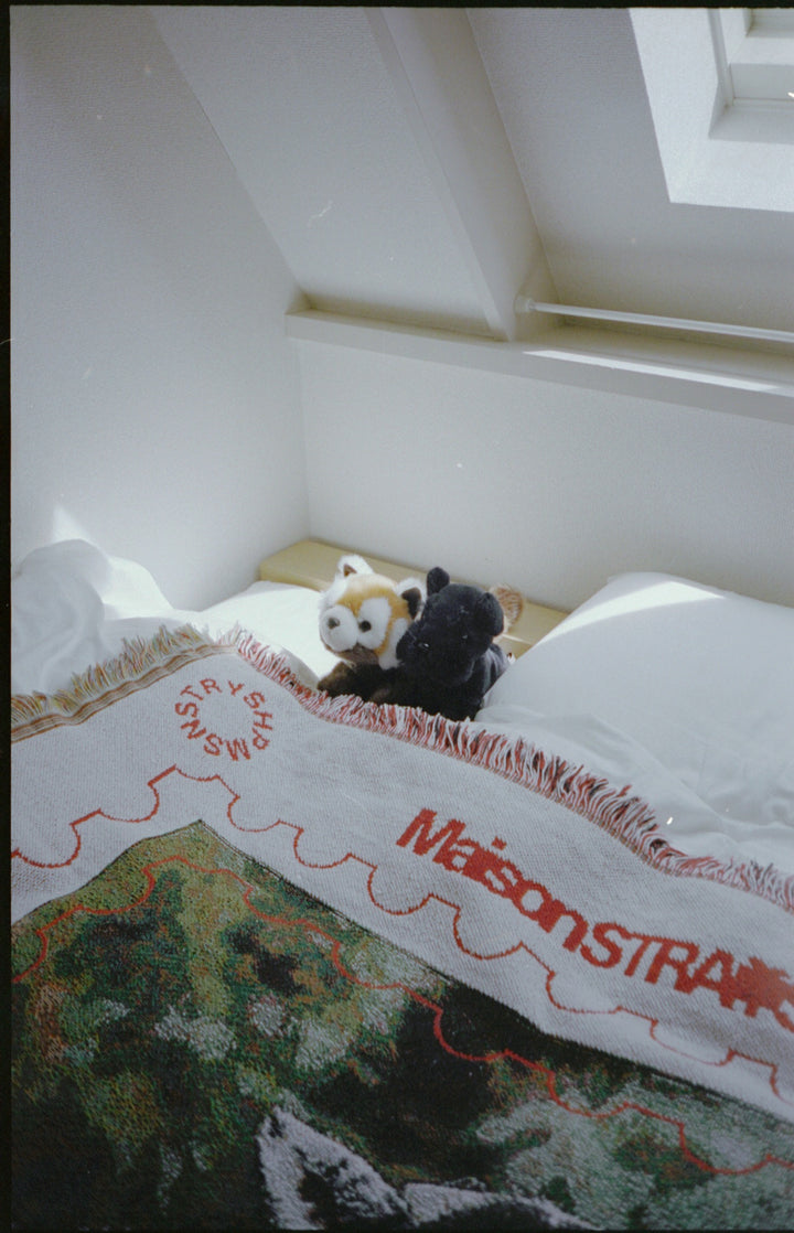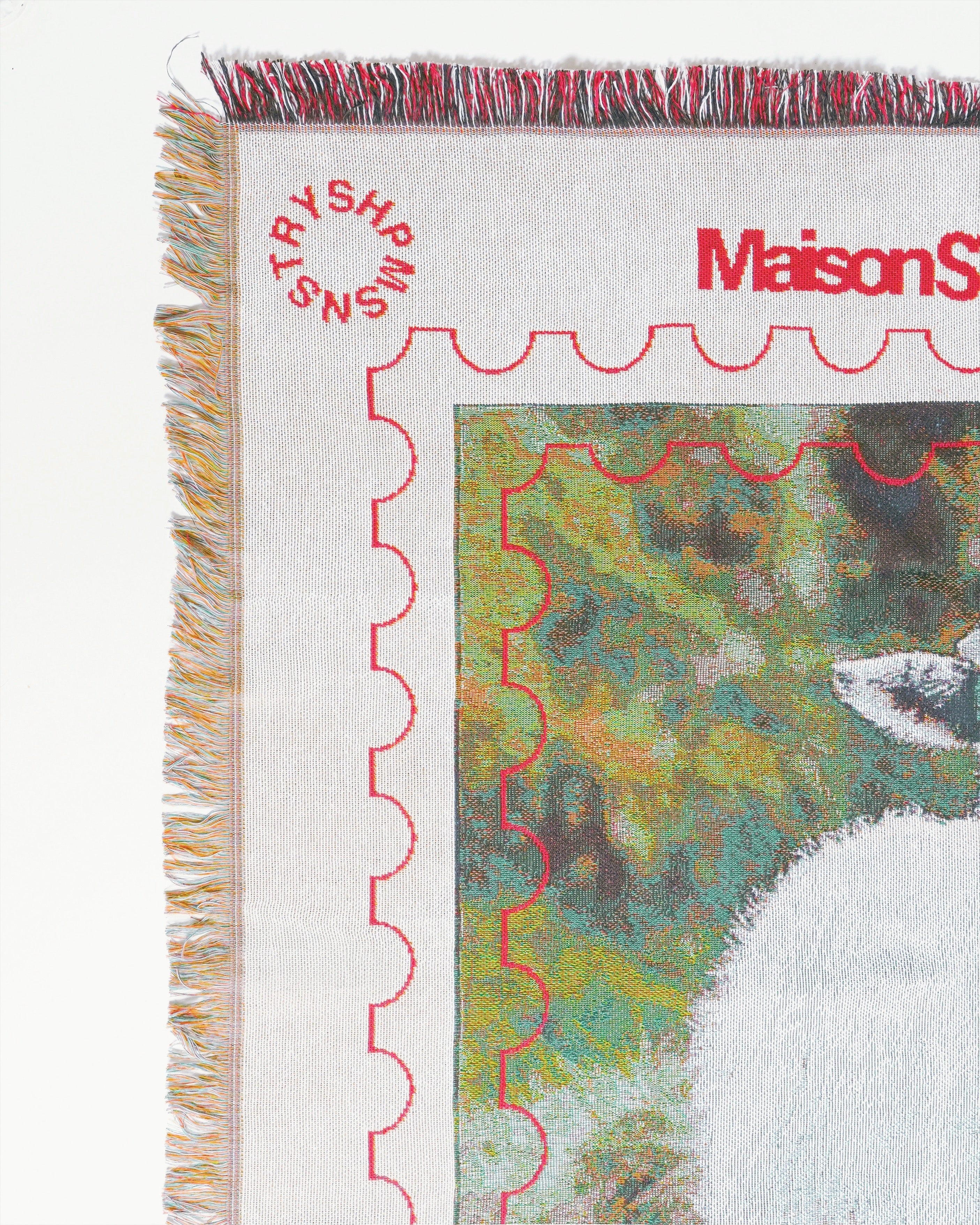 羊のブランケット兼ラグ。切手のようなグラフィックにMAISON STRAYSHEEPのアイコンである羊のイメージを配置。インテリアラグとして、ソファなどのブランケットカバーとしてもご使用頂けます。多数の糸を織り込み、グラフィックを表現しております。パターンのように感じられる仕組みが魅力的な製品です。